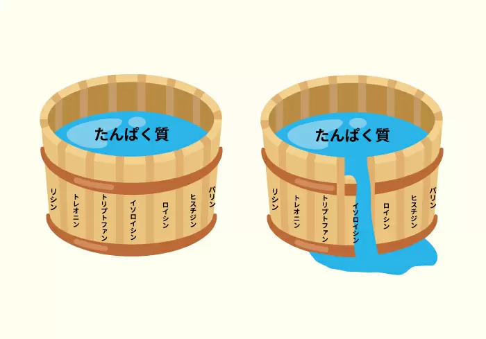 必須アミノ酸の残り8つが100に達していても、100以下の1つに合わせて利用されるため
